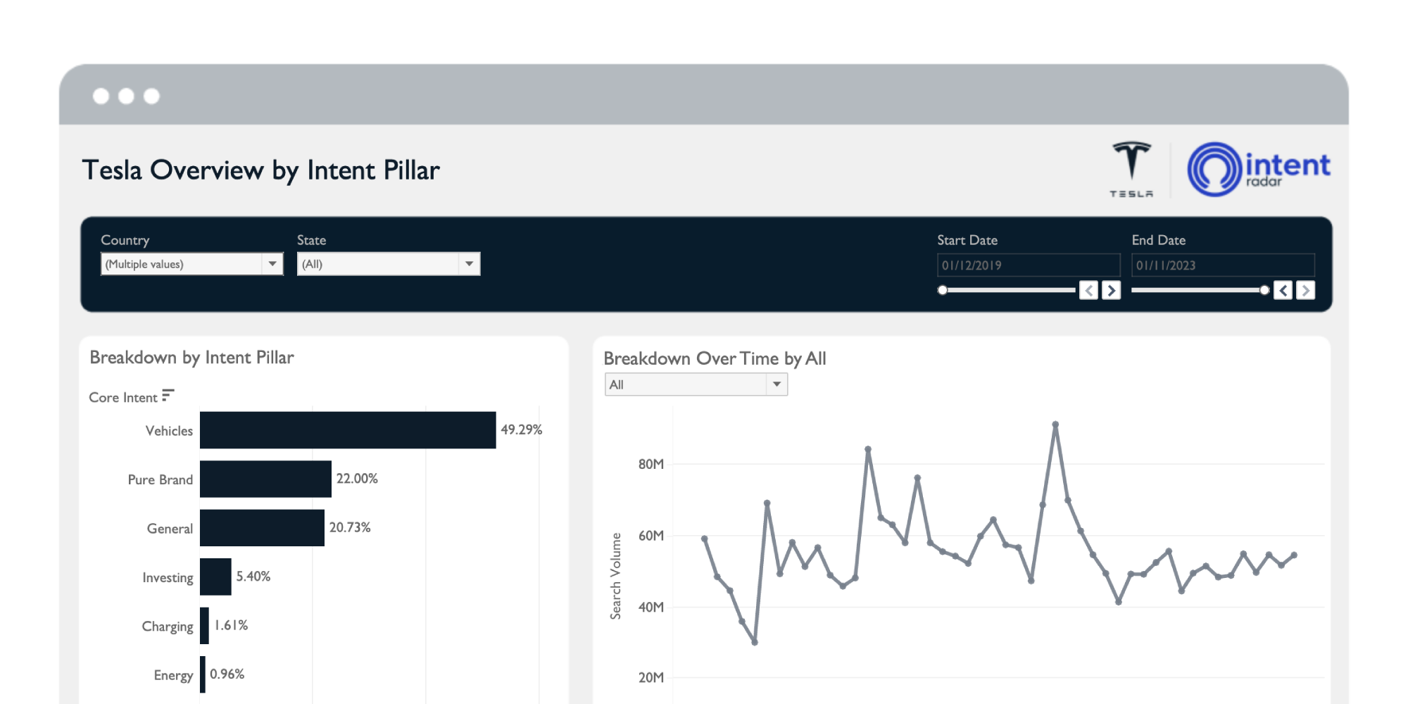- At IntentRadar, we built a highly-sophisticated model of Tesla search data with over 32,000 unique Tesla-related keywords, encompassing the full intent landscape for the brand